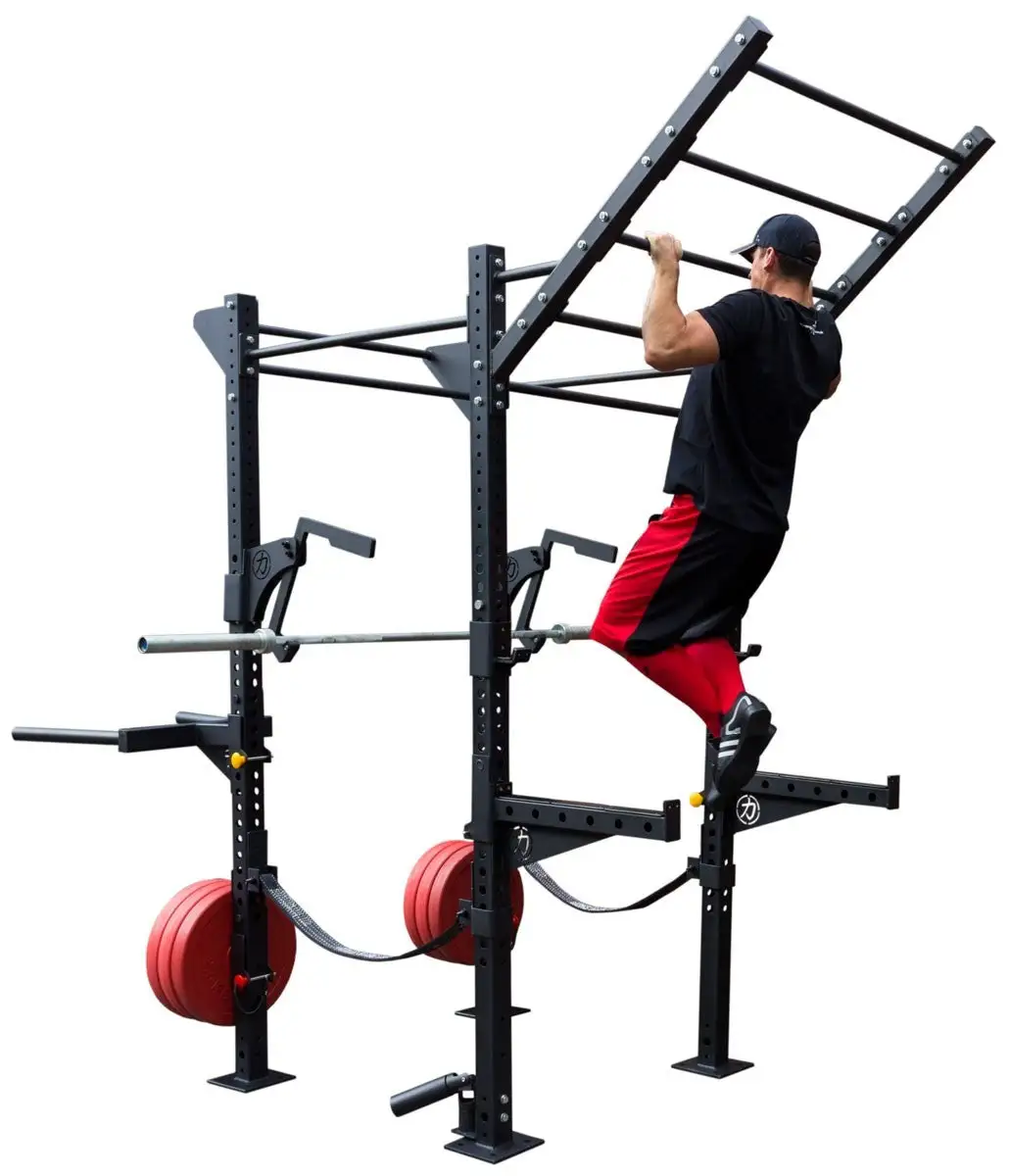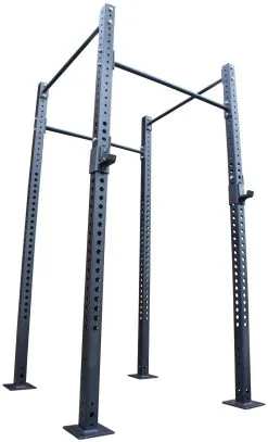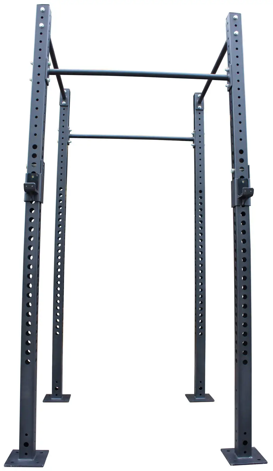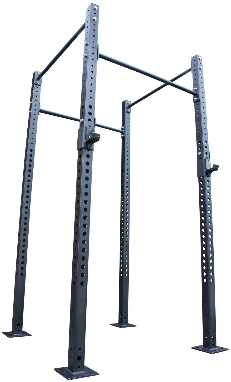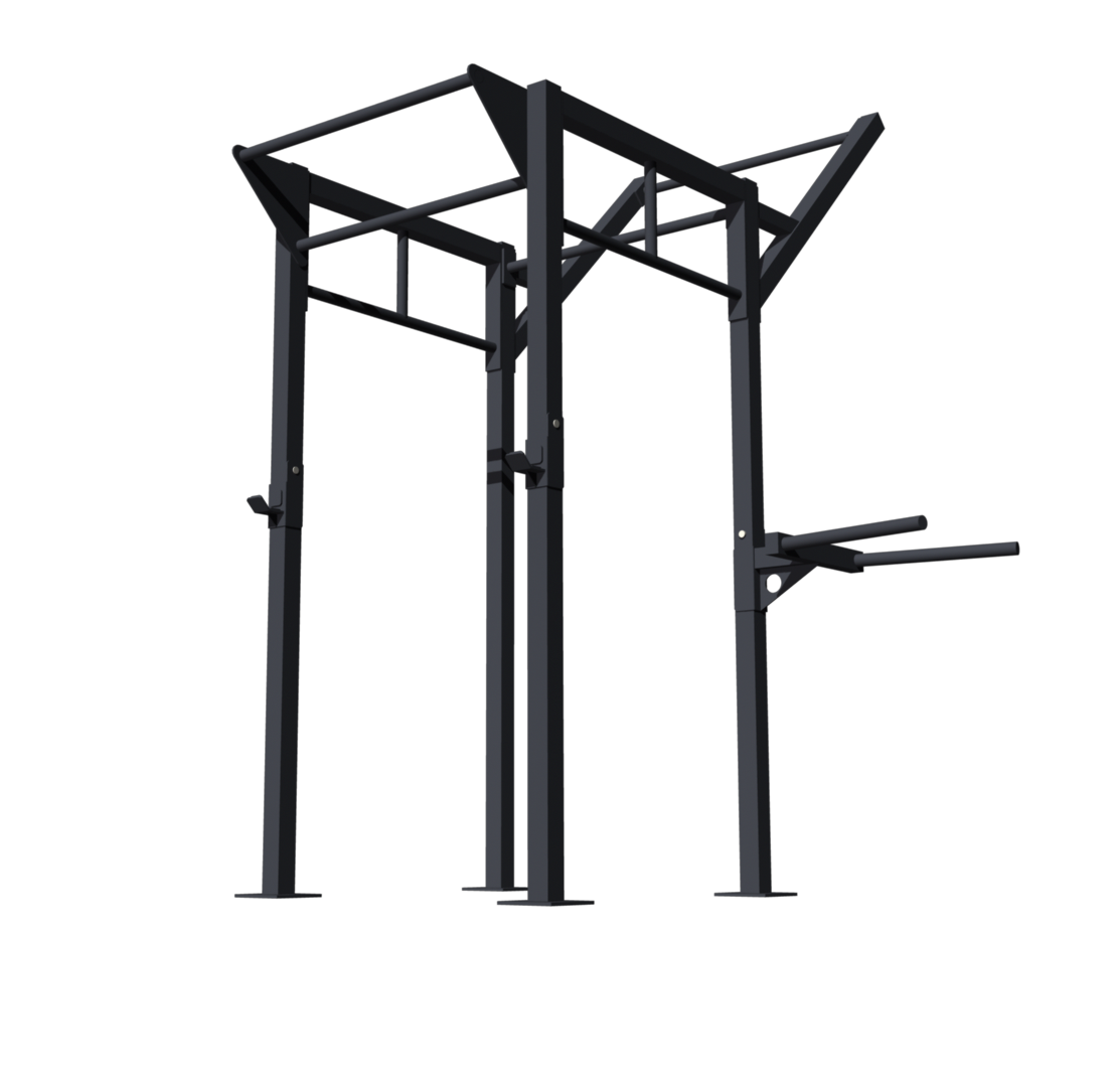 Vielseitige Trainingsstation mit 3mm dicken Grundpfeilern aus Stahl, mit Klimmzug- und Kniebeugestation sowie Möglichkeiten für vielseitige Erweiterungen.
