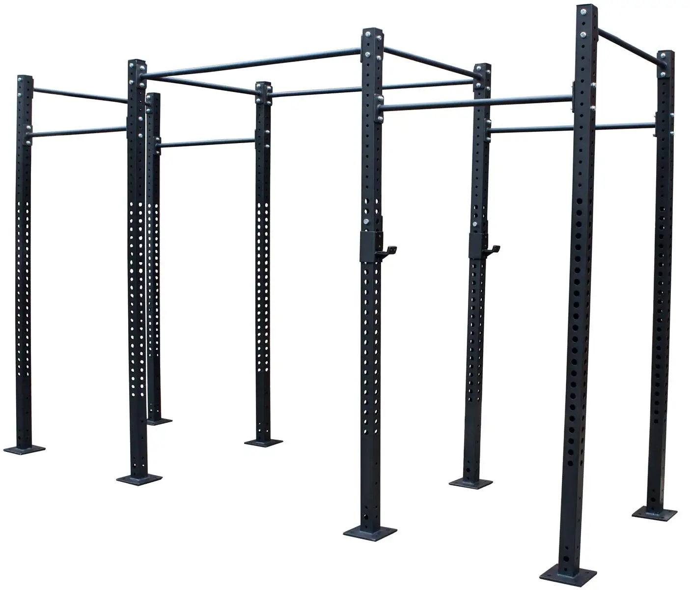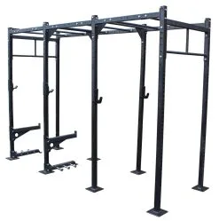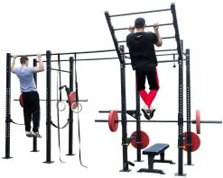 Vielseitige Trainingsstation mit 3 mm dicken Grundpfeilern aus Stahl, mit Klimmzug- und Kniebeugestation sowie Möglichkeiten für vielseitige Erweiterungen.