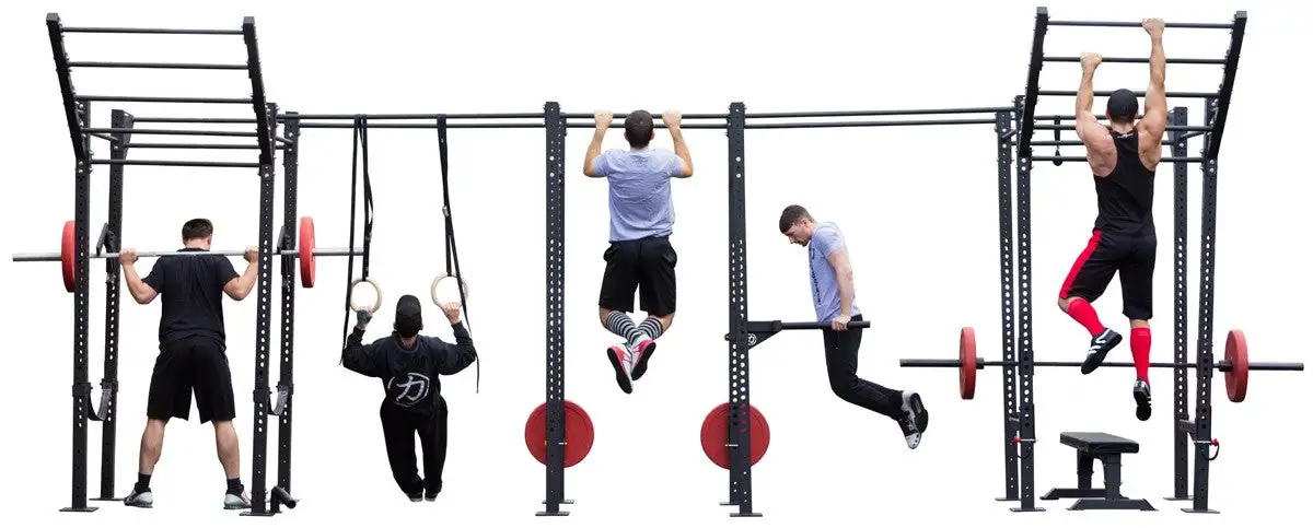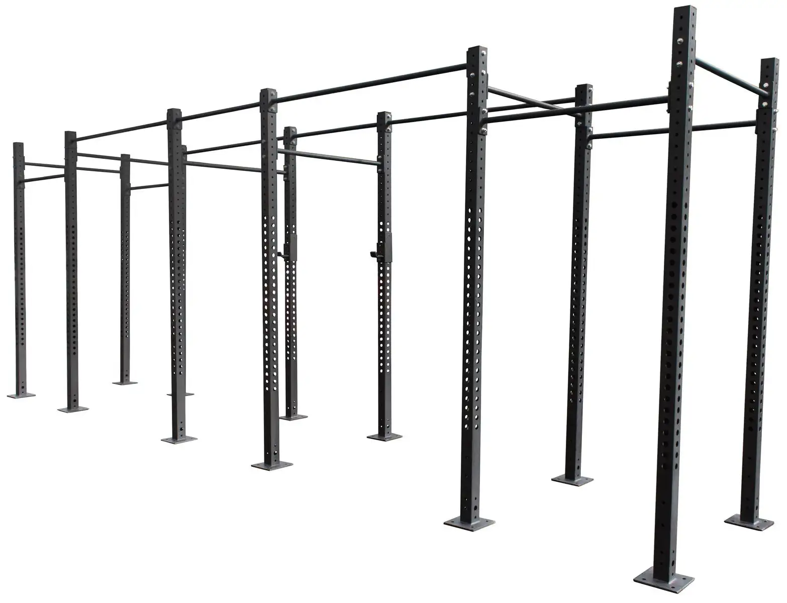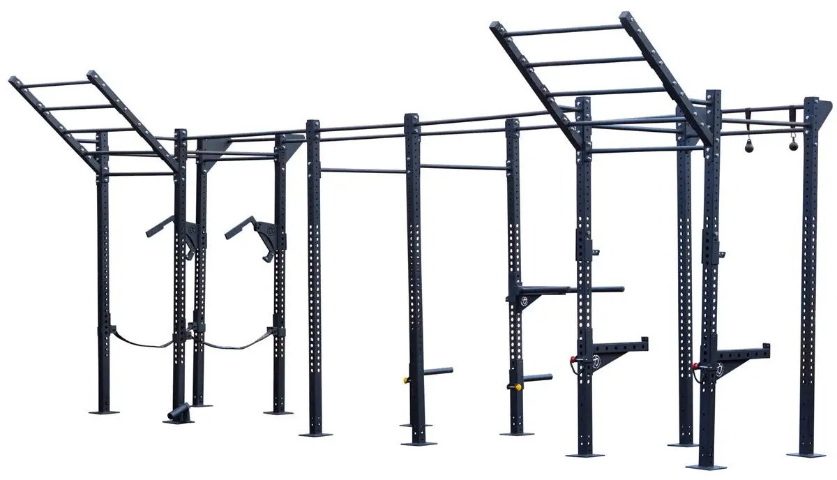 Vielseitige Trainingsstation mit 3mm dicken Grundpfeilern aus Stahl, mit Klimmzug- und Kniebeugestation sowie Möglichkeiten für vielseitige Erweiterungen.
