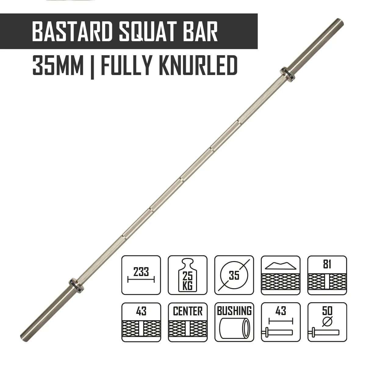 Die tiefe und grobe Rändelung gibt der Stange in der Hand und in der Ablage einen guten Grip. Zur einfachen Orientierung ist die Hantelstange mit Markierungen bei 81cm, 43cm und einer in der Markierung Mitte versehen. Mit einer Gesamtlänge von 233cm ist diese Bastard Squat Bar kürzer als unsere 32mm Bastard Squat Bar, hat aber das gleiche stabile Leergewicht von 25kg. Die Länge der beladbaren Scheibenaufnahme beträgt 43cm und kann mit bis zu 450kg belastet werden.