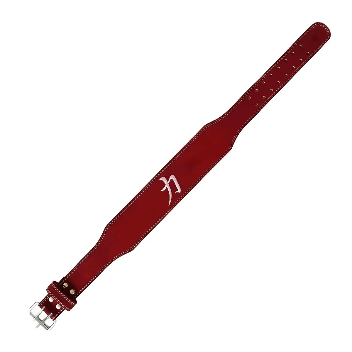 Weinroter Gewichthebergürtel mit breitem Rückenstück und Gürtelschnalle mit zwei Zinken.