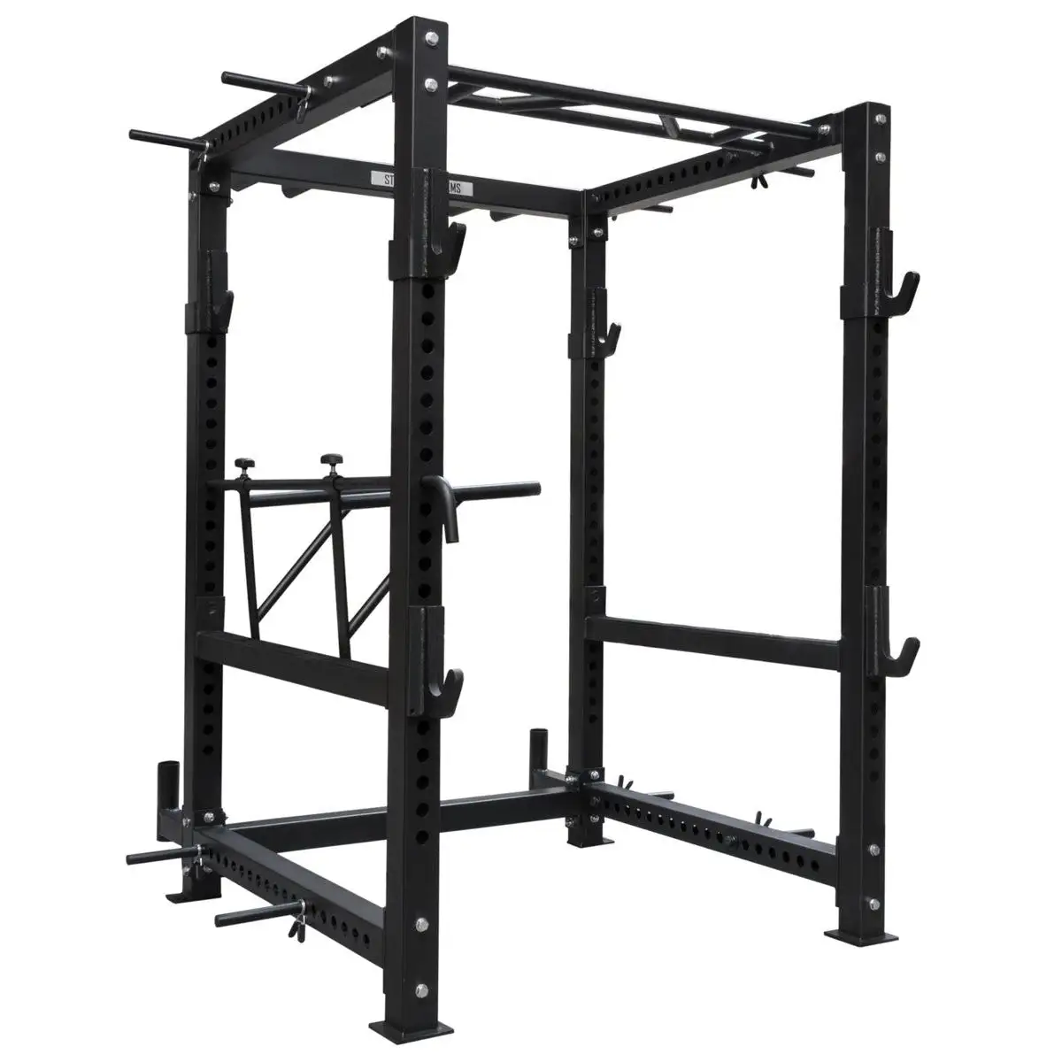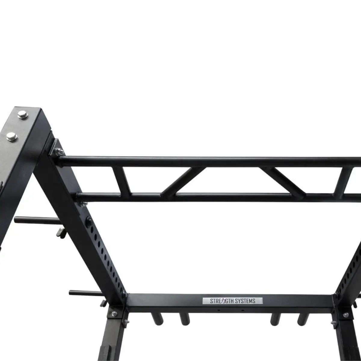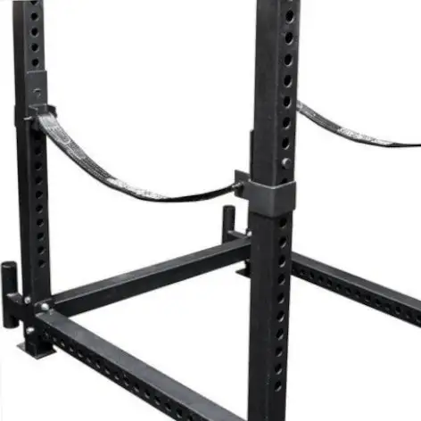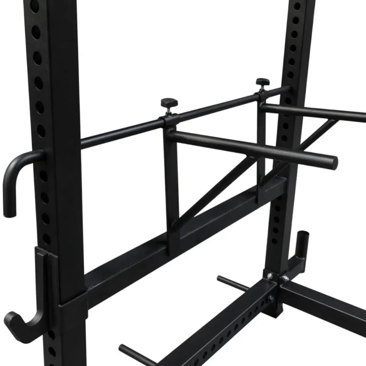 Im Lieferumfang enthalten sind Bolzen zur Befestigung von Bändern an der Ober- und Unterseite des Cages sowie Dip-Griffe, eine Klimmzugstange, Stangenhalter und Sicherheitsstangen.