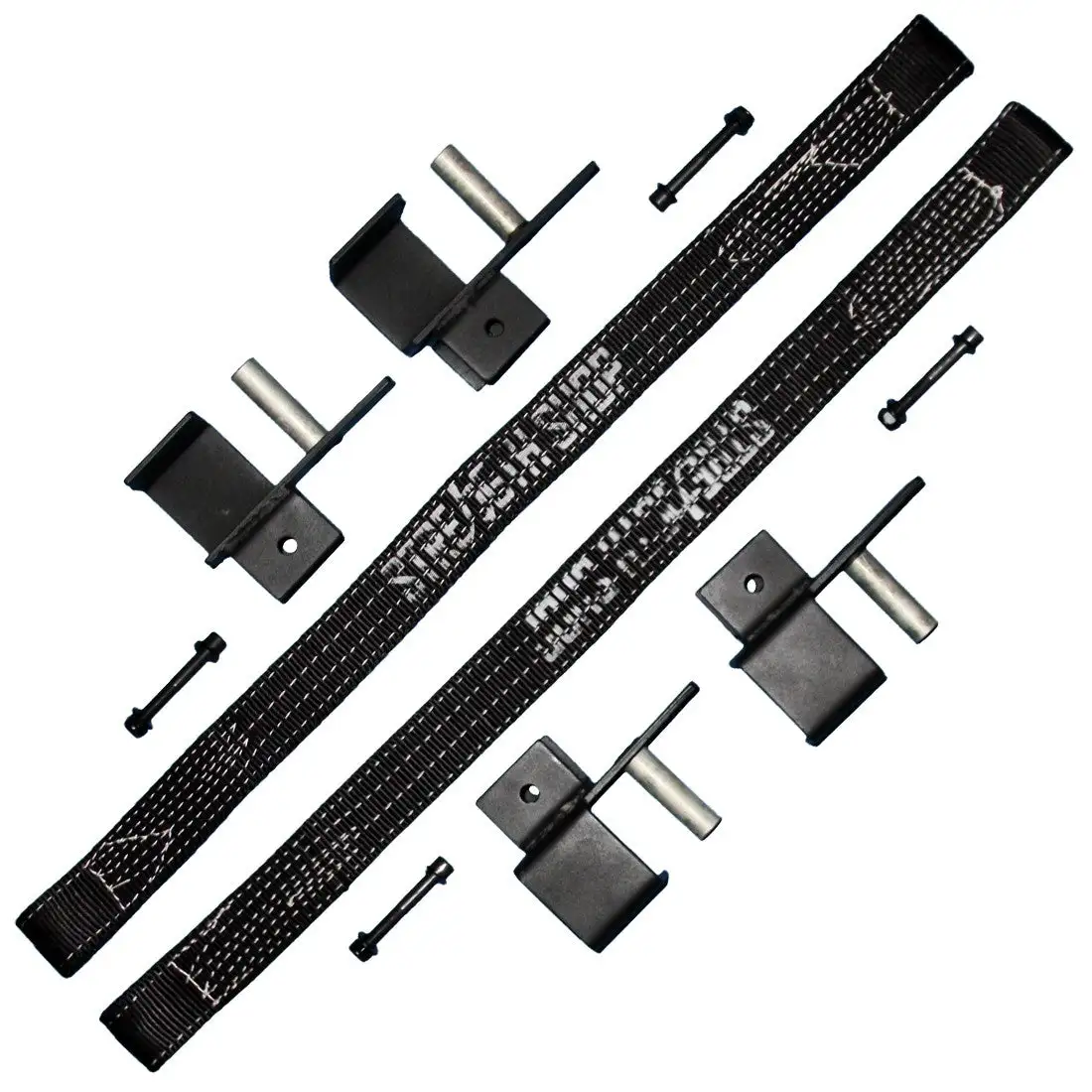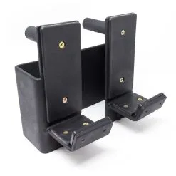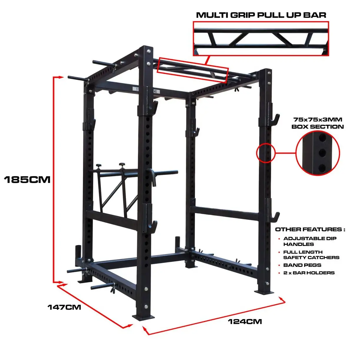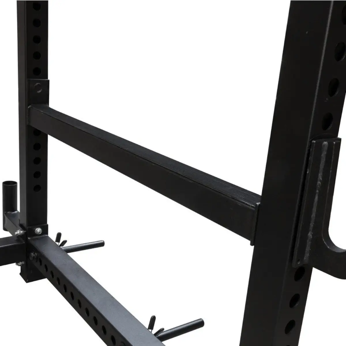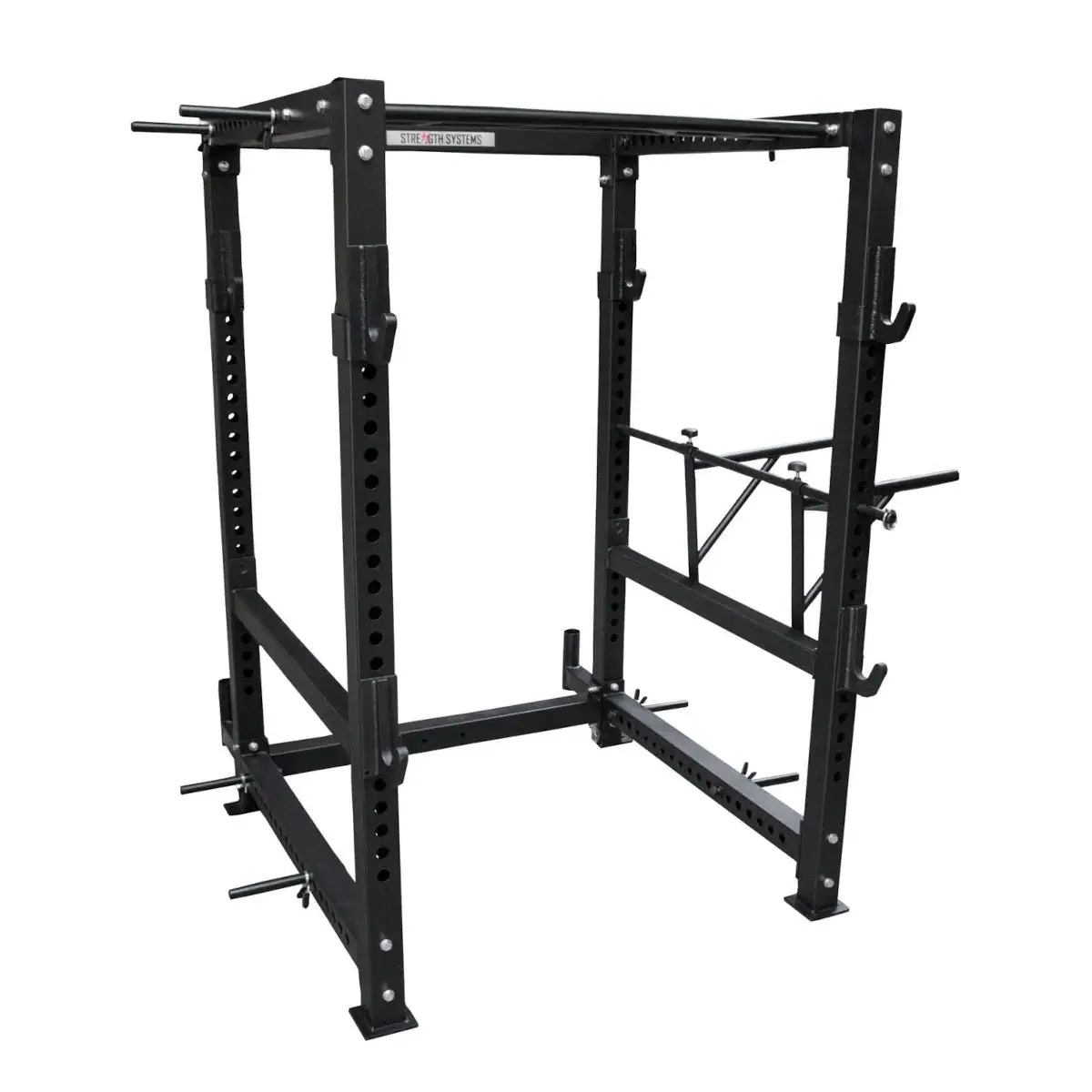 Im Lieferumfang enthalten sind Bolzen zur Befestigung von Bändern an der Ober- und Unterseite des Cages sowie Dip-Griffe, eine Klimmzugstange, Stangenhalter und Sicherheitsstangen.