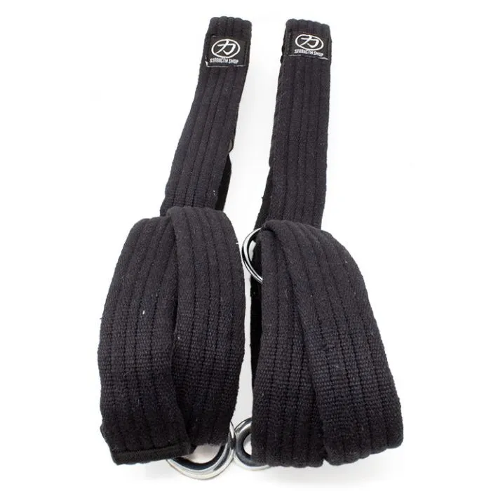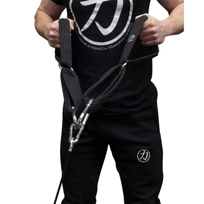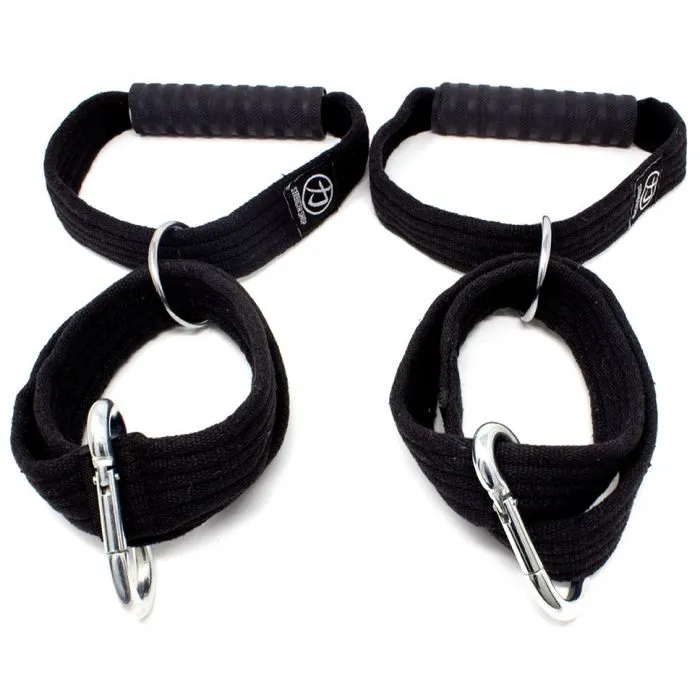 Jeder Kabelgriff besteht aus zwei Schlaufen, aus extra festem Gewebe, die mit einem Metallring verbunden sind. Die Kabelgriffe haben einen verstärkten Griff mit einer Softgrip-Oberfläche für mehr Komfort und Stabilität. Die beiden Schlaufen können sich zueinander drehen, sodass in verschiedenen Winkeln gezogen werden kann, um unterschiedliche Muskeln anzusprechen. Sie können an Kabelmaschinen befestigt werden oder auch an Schlingen für den Sled Pull. Die Griffe sind in klassischem Schwarz gehalten.