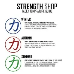 Die charakteristisch gelbe Farbe kommt von dem Hauptbestandteil: Kiefernharz. Diese härtere Mischung wurde für wärmere Bedingungen formuliert und muss etwas erwärmt werden, bevor es einsatzfähig ist. Der Sommer-Mix kann für höhere Temperaturbereiche verwendet werden und ist vor allem auch eine gute Wahl für Wettkämpfe. Im Strength Shop Tacky Temperature Guide findest du einen schnellen Überblick über die Strength Shop Tacky-Mischungen, um die für dich geeignete Variante zu finden.